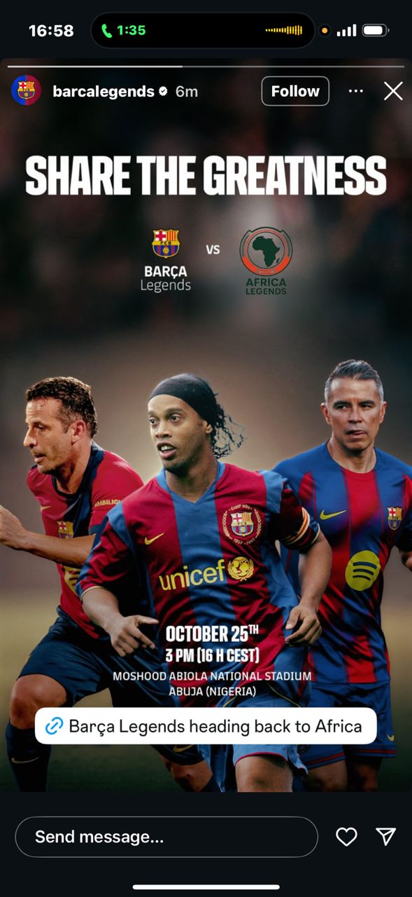 35 Days to Go: Ronaldinho, Saviola, Giuly, Others, Amongst First Barca Legends to Officially Confirm Participation for Champions Cup in Abuja