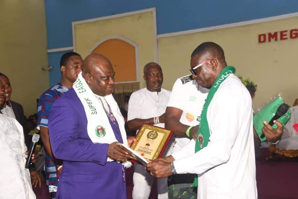 At the investiture of the award, the President of Super Eagle supporters club says “on behalf of the executives and members of supper Eagles supporters club Worldwide I want to at my capacity as the President of the club to induct our father in the Lord General Overseer of Omega Power Ministries as OUR NATIONAL PATRON OF SUPER EAGLES SUPPORTERS CLUB. “