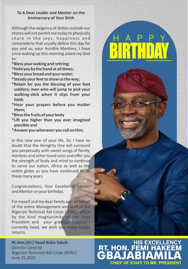 Director General of the Nigerian Technical Aid Corps,Rt.Hon.Yusuf Buba Yakub has described President Tinubu’s Chief of Staff and immediate-past Speaker, Nigeria’s House of Representatives,Rt.Hon.Femi Gbajabiamila as a selfless leader and nationalist who deserves the constant support and prayers of every Nigerian, especially those who have gained from his wealth of knowledge and leadership impact in over the past twenty years as a national figure.