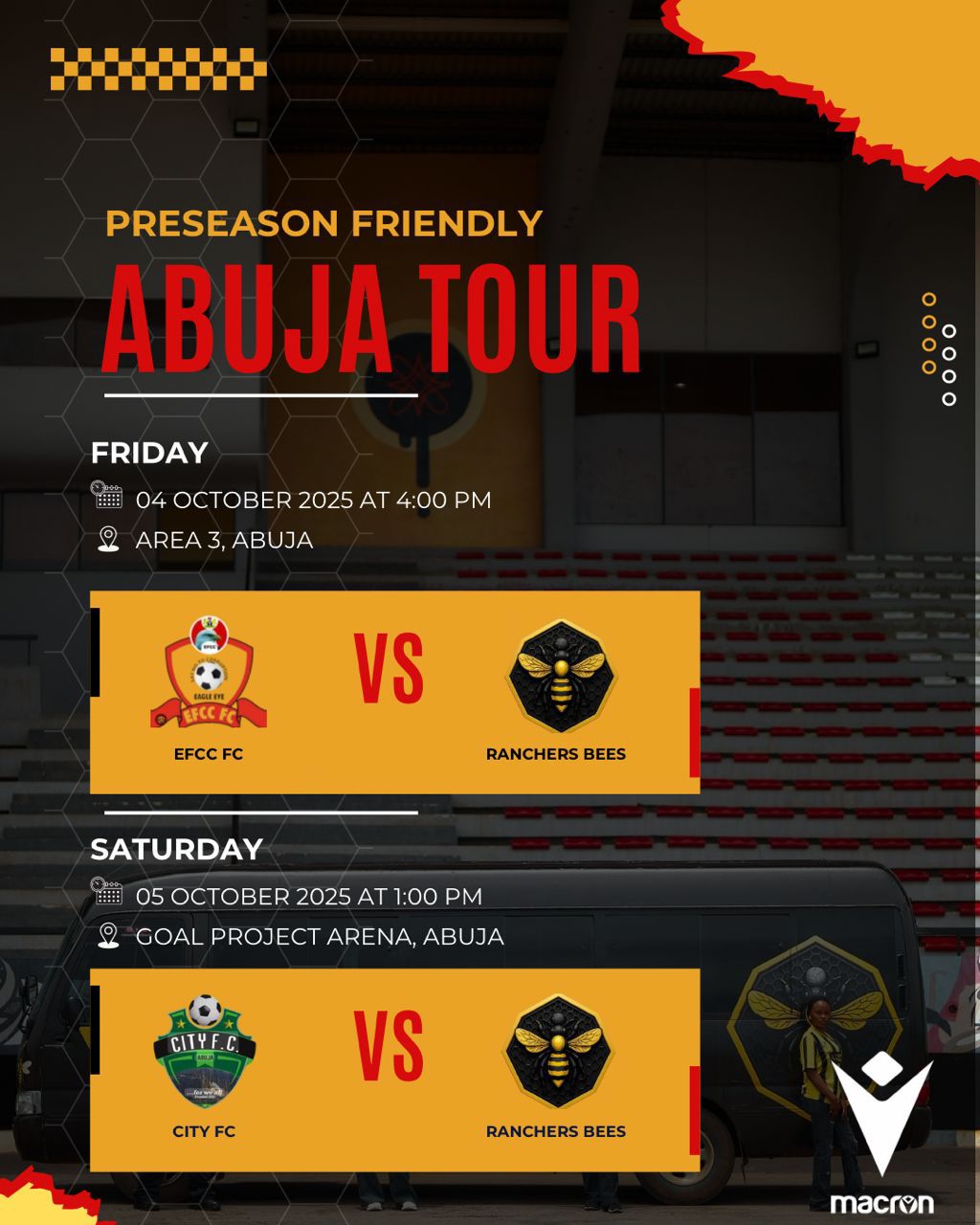 On October 4th and 5th, Ranchers Bees will face EFCC FC and City FC Abuja, respectively, in a bid to fine-tune their skills and build team cohesion ahead of their NNL opener against Gombe United in November.