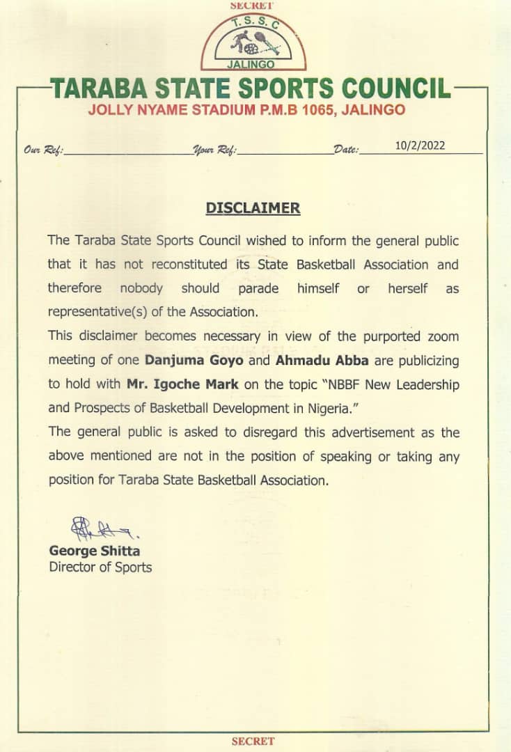 The Taraba State Sports Council has disowned the purported zoom meeting being organized by one Danjuma Goyo and Ahmadu Abba for Igoche Mark on the NBBF New Leadership and Prospects of Basketball Development in Nigeria.