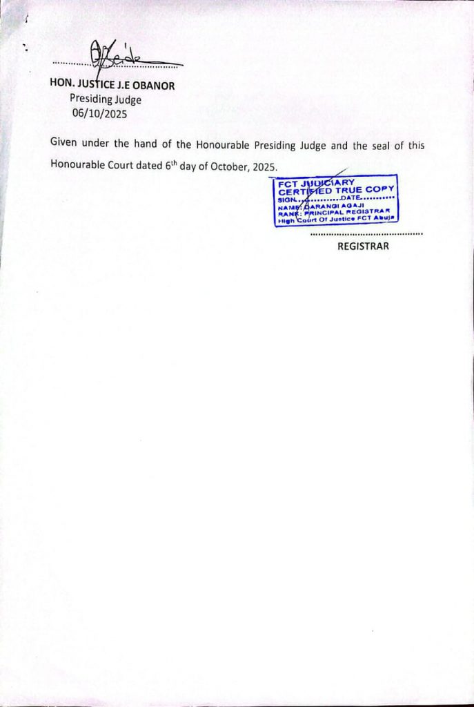 Justice J. E. Obanor, in an order dated October 6, 2025, in suit no: FCT/HC/CV/3803/2025 and motion no: M/12204/2025, sighted by our correspondent, directed the Inspector General of Police and the Department of State Services (DSS) to enforce the court’s order.